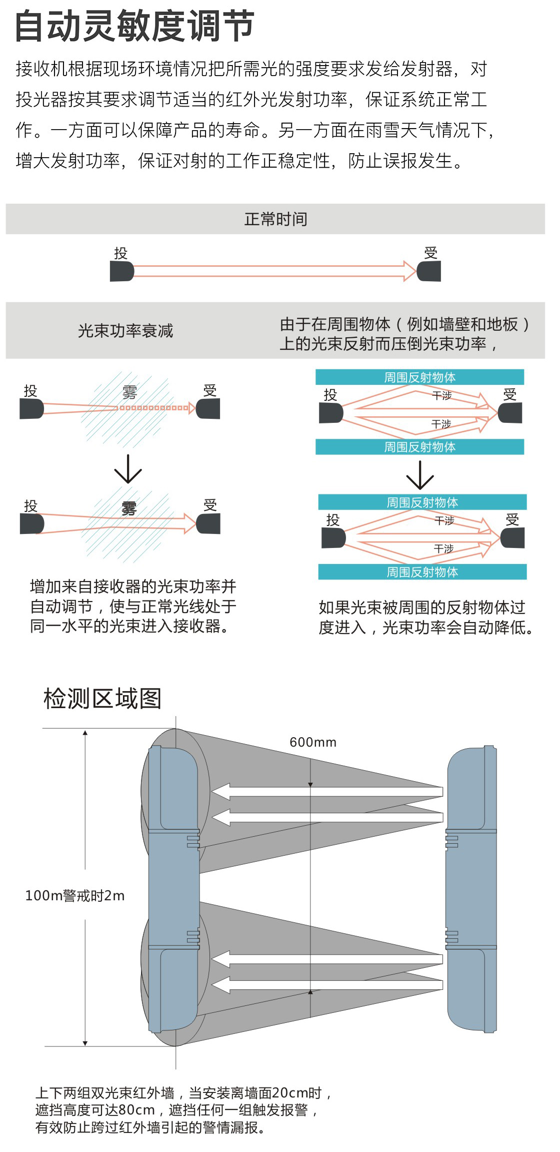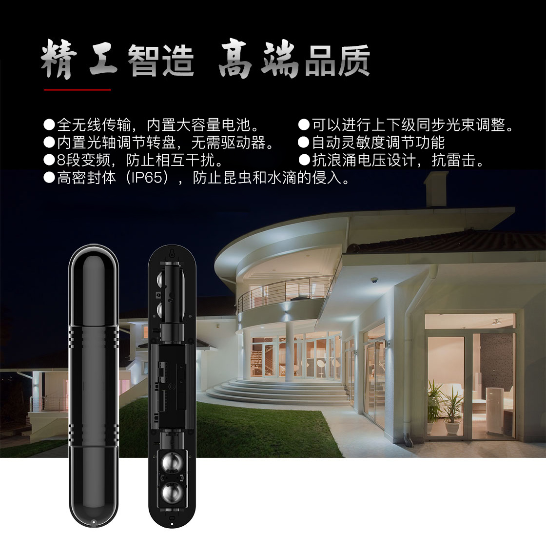 ◎ 全无线传输,内置大容量电池。 ◎ 可以进行上下级同步光束调整。 ◎ 内置光轴调节转盘,无需驱动器。 ◎ 自动灵敏度调节功能 ◎ 8段变频,防止相互干扰。 ◎ 抗浪涌电压设计,抗雷击。 ◎ 高密封体(IP65),防止昆虫和水滴的侵入。