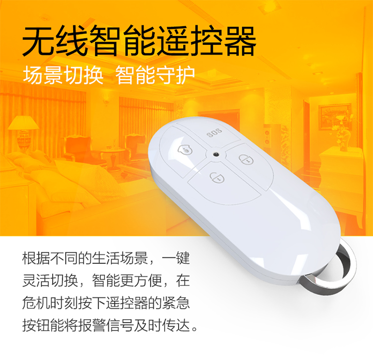 ◎ 4按键无线遥控器; ◎ 适配美安科技无线报警主机; ◎ 具有紧急按钮和家庭自动化主机遥控作用; ◎ 时尚潮流外观设计,既可做装饰品也方便携带; ◎ 200米范围以内灵敏度极高。